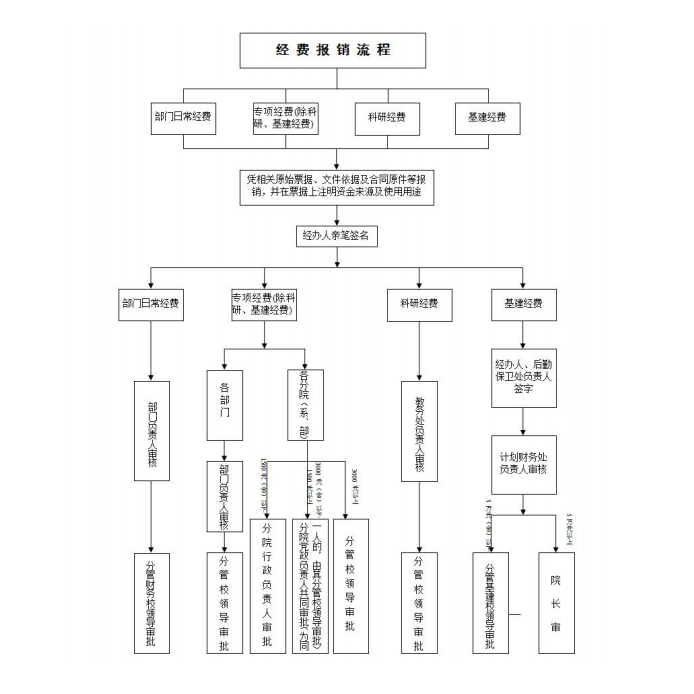 三、各分院(系、部)预算经费报销经本分院(系、部) 经办人签字,按照审批金额权限不同由相应负责人审批后, 在票据上注明资金来源及使用用途,到学校会计核算中心办理相关报销手续。