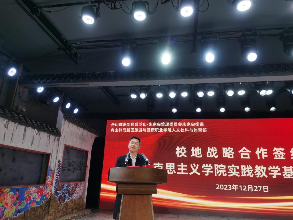 为进一步发挥高校在地方经济社会发展中的重要作用,实现双方优势互补与共同发展,2023年12月27日下午,舟山群岛新区旅游与健康职业学院人文社科与体育部和舟山群岛新区普陀山朱家尖管委会朱家尖街道在樟洲村文化礼堂共同举行校地合作等系列活动。参加本次活动的有普朱管委会党群工作部部长赵正豪、人文社科与体育部党总支书记主任张毅,科研与社会服务处副处长李慧刚等领导同志,以及师生、街道、村的相关代表共60余人。