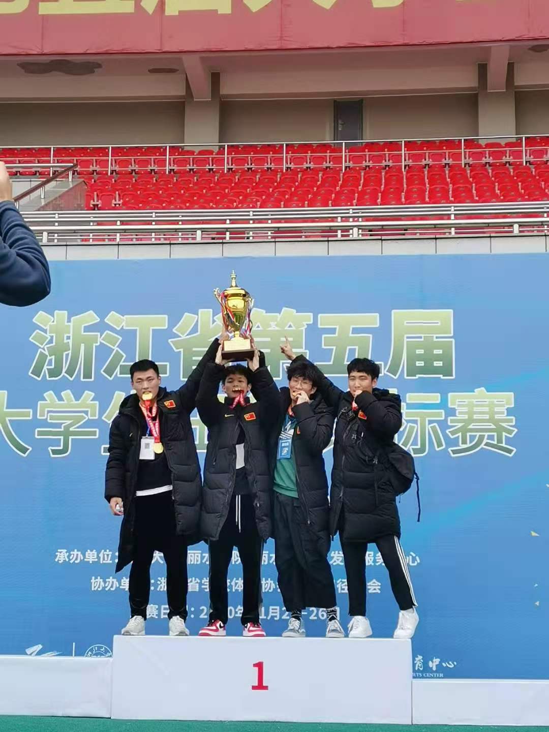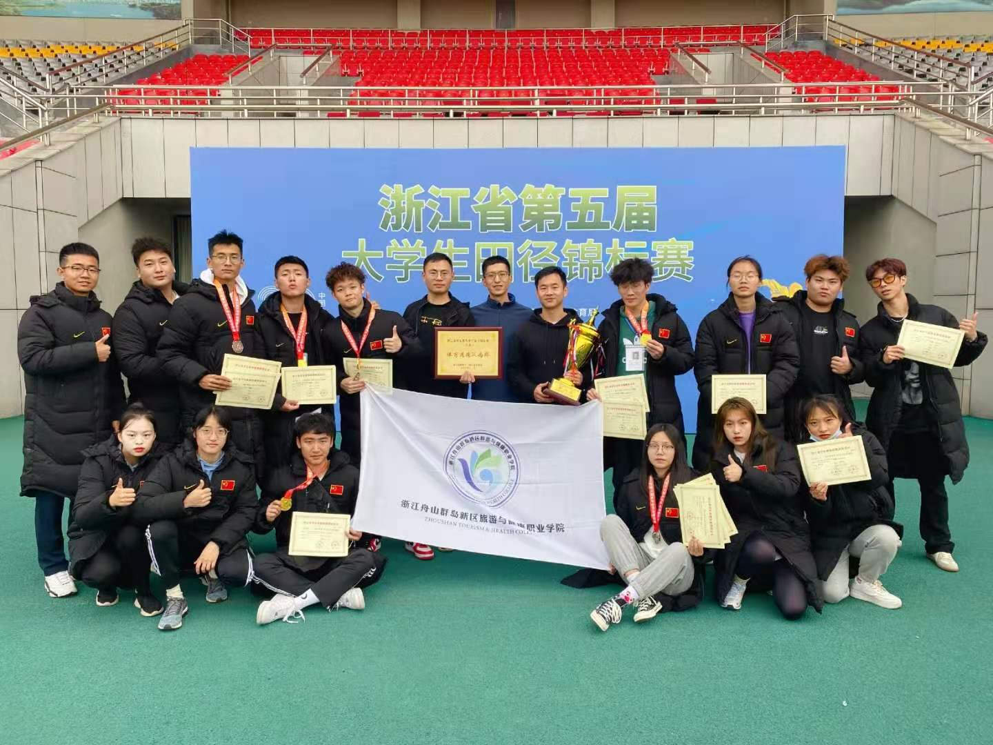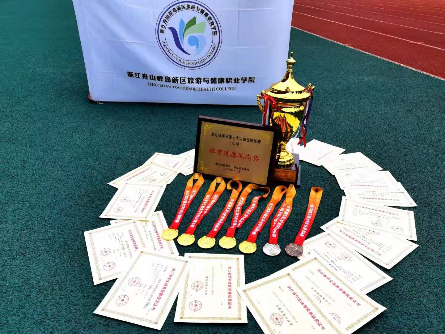 11月26日,由浙江省教育厅、浙江省体育局主办的浙江省第五届大学生田径锦标赛落下帷幕。我校田径队在历经二个多月的艰苦训练后,共有十五位学子参赛,斩获乙组男子4*100团体第一名,乙组男子100米第一名、第七名,乙组男子跳高第三名,乙组男子铁饼第四名,乙组男子800米第八;乙组女子1500米第二名,乙组女子800米第七的好成绩,共摘得五金一银一铜。男子团体总分获得乙组第六名,囊收乙组道德风尚奖的荣誉,指导教练郑将栋获得“最佳优秀教练”荣誉称号,厉展铭、毛丽飞、陶开伟获得“优秀运动员”称号。