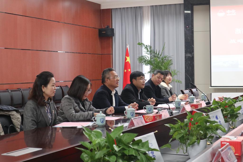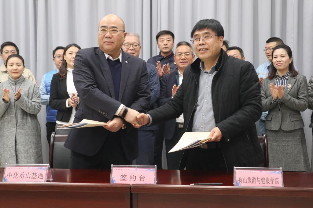 签约仪式在岙山基地培训学校会议室进行,仪式前主宾双方进行了简短而富有成效的座谈。会上,唐炳文总经理简要介绍了基地建设、运行的基本情况。就双方产学合作,他指出,学校优质的师资团队将首先为中化岙山基地提高公务、商务及接待礼仪等管理水平提供专业技能培训,提升基地国内外及区域的影响力;随着合作的深入,在培训服务基础上,进一步拓展项目研究、人力资源支持、实践基地建设以及双方平台建设共建共享等方面的合作项目与合作空间,发挥高等职业院校与中央企业优势,互为助力,携手共进。