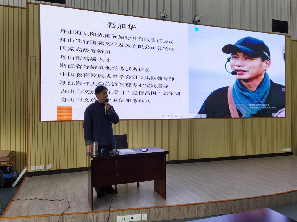 2020年12月26日下午,人文社科与体育部人文教研室特邀舟山文化旅游行业领军人——吾旭华老师开展了一场”诗与远方、始于足下——传统文化创新与应用”专题讲座,人文教研室教师和全校各专业200多位学生共同聆听行业专家的实践报告。