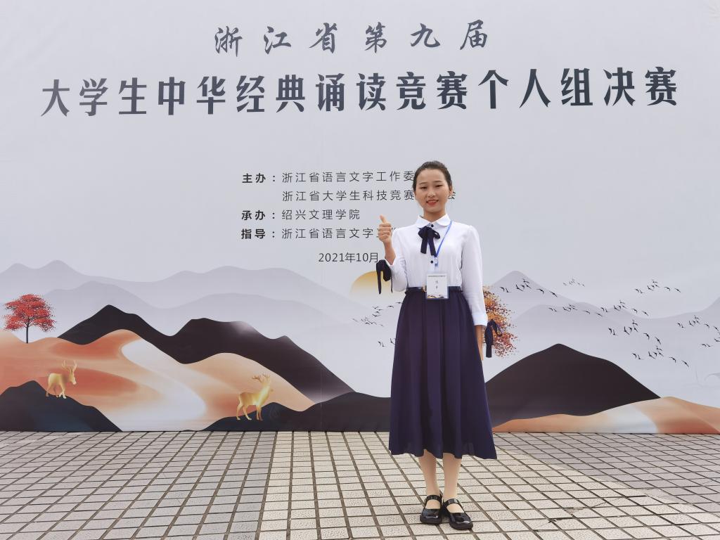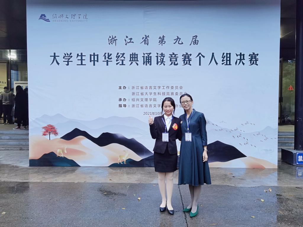 2021年10月16-17日,浙江省第九届大学生中华经典诵读决赛在绍兴文理学院举行,经过激烈角逐,我校郑小如同学获得个人组一等奖,自此我校参加本届比赛从选送作品预赛到个人现场决赛历时半年、完满收官。